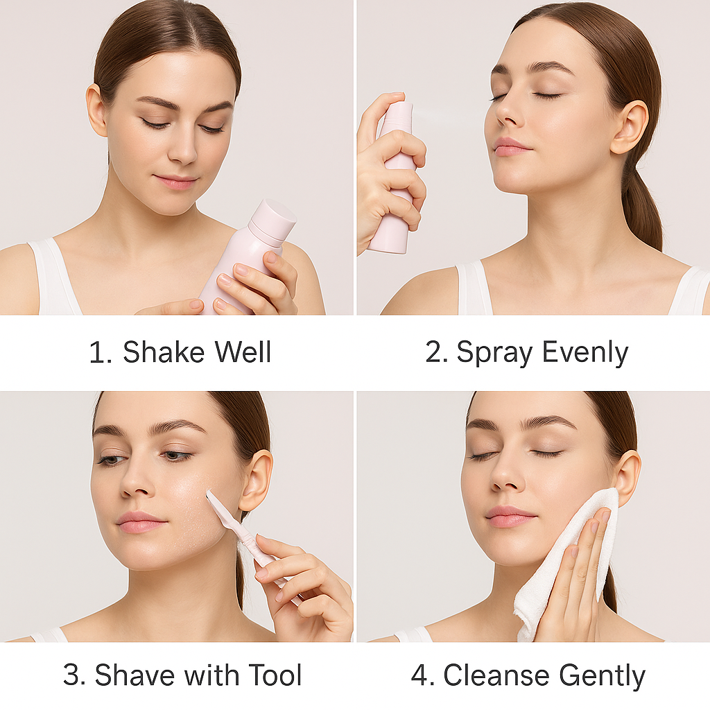 Before using the spray, fine hair remain hidden, making grooming guesswork. After one spray, every strand is clearly visible, allowing for precise, smooth hair removal and a cleaner, glowing finish.